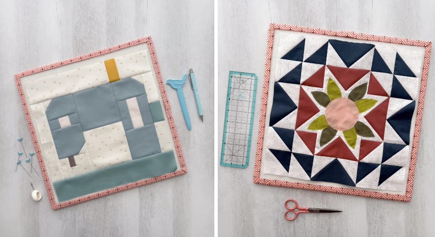 Ties that Bind block by Jennifer Long and the I Love You Sew block by Sandy Klop. These block designs are so beautiful. Jennifer’s block includes a printable template to use for the Raw Edge Applique technique and embroidery element to add a flourish to your block! The applique and embroidery element is optional.